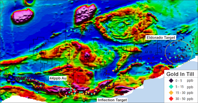 The Inflection Target – Showing an anomalous trend of till samples extending over 6.5 kilometres, ranging from 10 ppb to 44 ppb gold